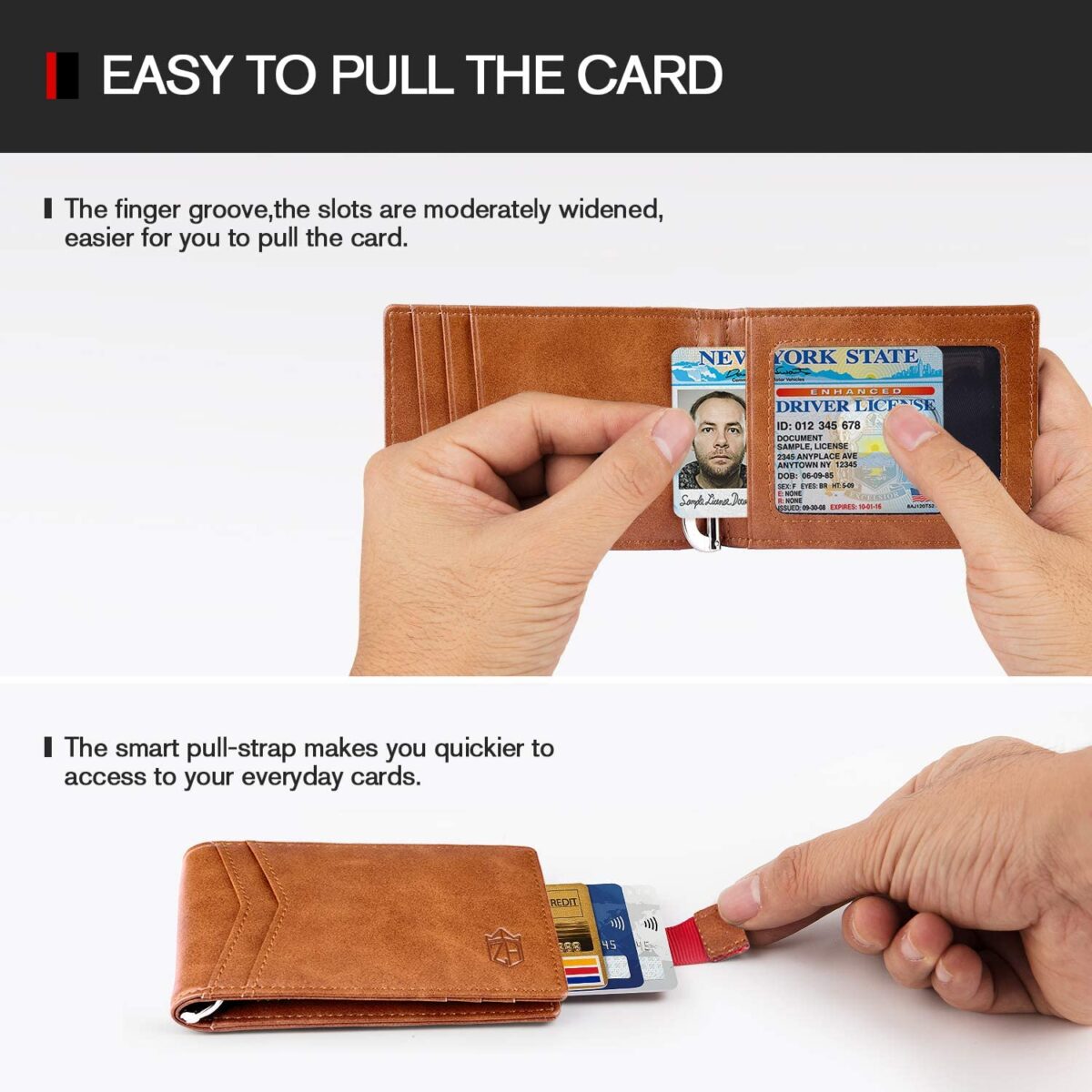I needed a new wallet and found this one searching Amazon. I really like this. It’s nice looking and very slim. You absolutely notice a difference in your pocket when sitting down. It’s very easy to get to your money. I was wondering if the clip would work and be tight enough to keep the dollar bills secure…it does work. I’ve been using this for almost two months now and no money has ever slid out, I can even shake it and the bills stay secure. It takes some getting used to opening your wallet in the store and having all your bills right there but it’s really not that big of a deal, you learn how to pull out your money without exposing everything you got. There are 5 places for cards on one side (three on the inside and two on the outside). On the other side of the wallet is where you put your everyday use cards. I love the strap, you pull the strap and all the cards slide partially out for easy access. There are so many smart things about this wallet plus it’s excellent design and great quality. Would definitely recommend.