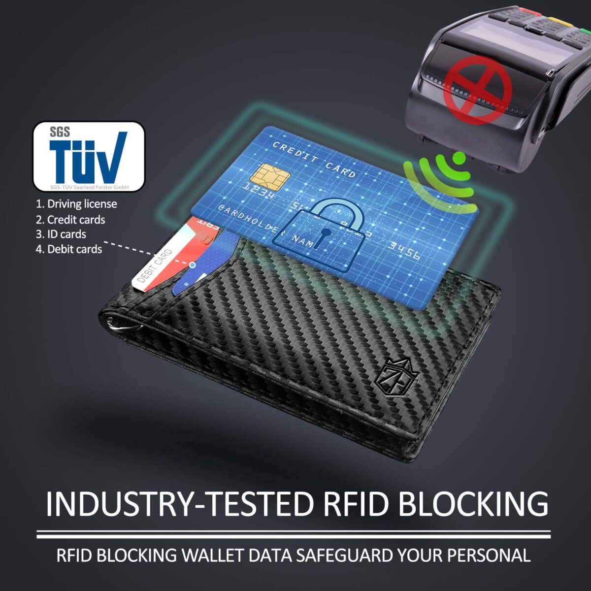 I bought my first [Belroy] minimalist style wallet in 2017. I loved the style and ease of use, but the suede like material quickly began to look worn with very little use. This holiday season I finally decided to purchase a replacement and settled on this wallet in Carbon Fiber look which hopefully wont look worn too quickly.The CF pattern looks better in hand than in the photo. The material feels nice and all the card slots accepted cards with no issue. I packed the money clip with 15 bills, 3 (2 credit and 1 Tesla key) cards on the inside slots + plus 2 ID cards in the window slot. I put 2 cards plus a paper card in the pocket compartment. The wallet folds up easily and looks feel clean and neat.RFID shielding is a critical requirement for me now since many cards are now RFID enabled such as my Tesla key card. I tested my Tesla key card in the outside sleeve, the inside sleeve, and the pocket storage and the car could not read it so as far as I’m concerned the RFID shielding is working.It is a minimalist design, but the wallet is a bit bigger than my previous Belroy. The additional size so far does not bother me, see the included picture.Bottom line based on what I know at this moment it lives up to the advertisement and I’d recommend it without hesitation. I’m actually thinking of buying another one in brown.